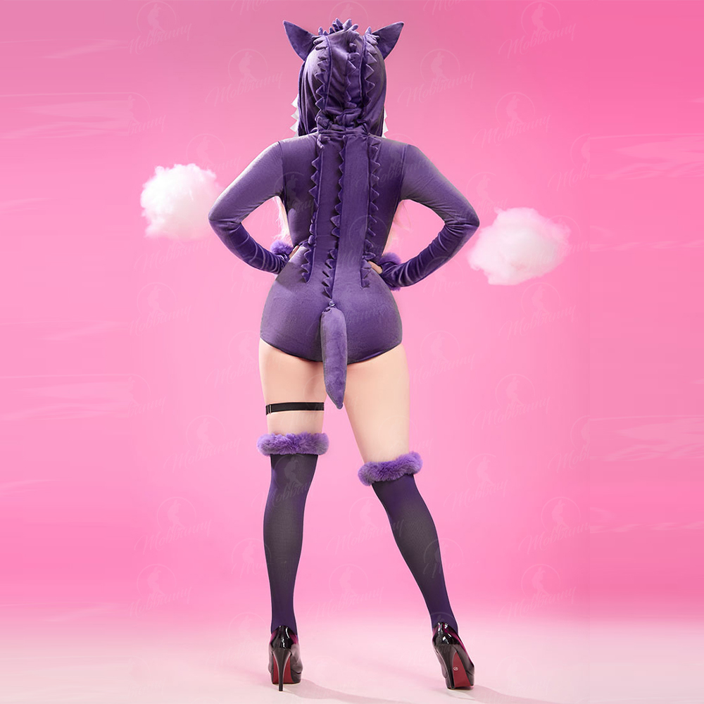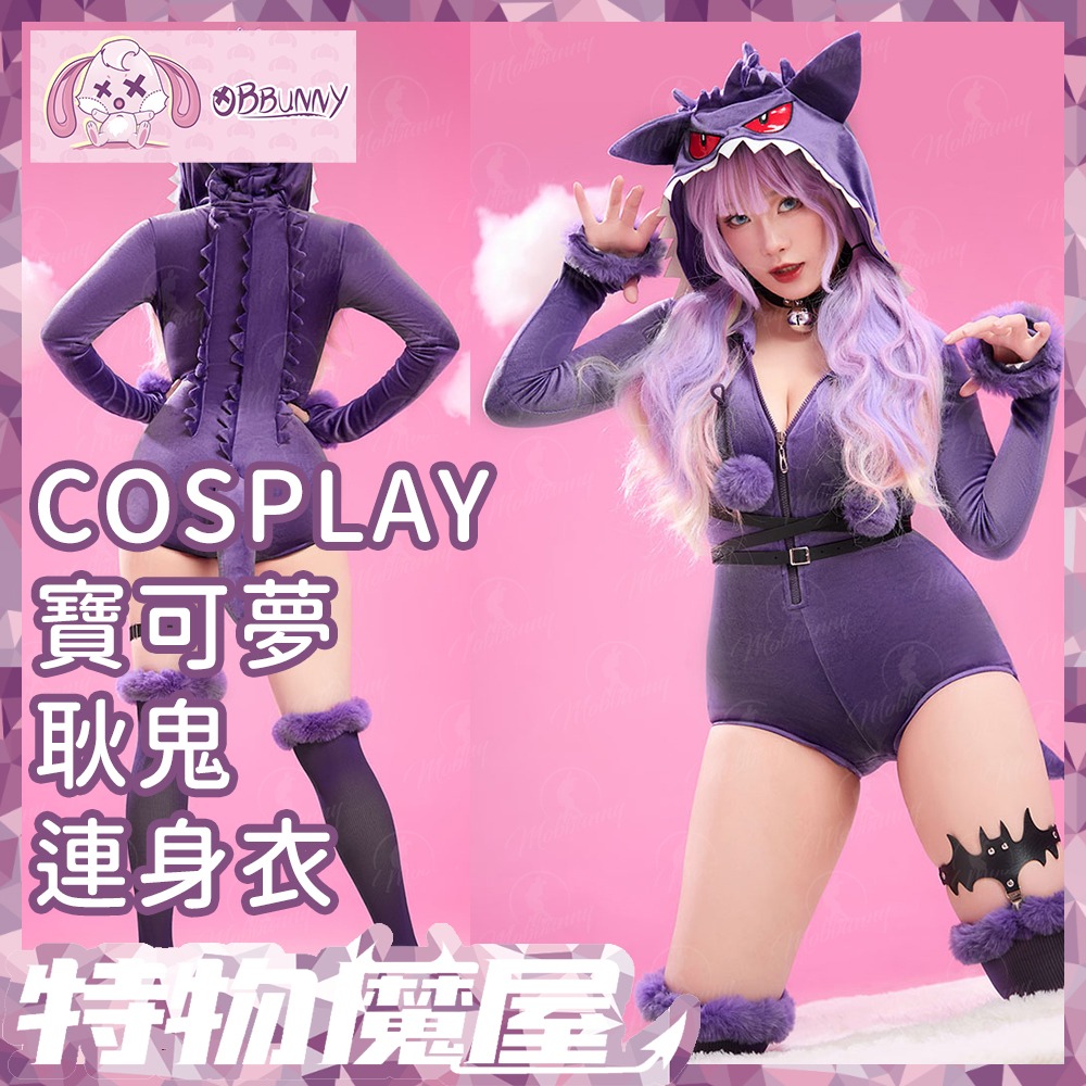 商品名稱:OSPLAY角色扮演萬聖節 原創寶可夢神奇寶貝耿鬼 毛絨連身連帽衣 緊身衣 長袖高叉開胸拉鍊綁帶