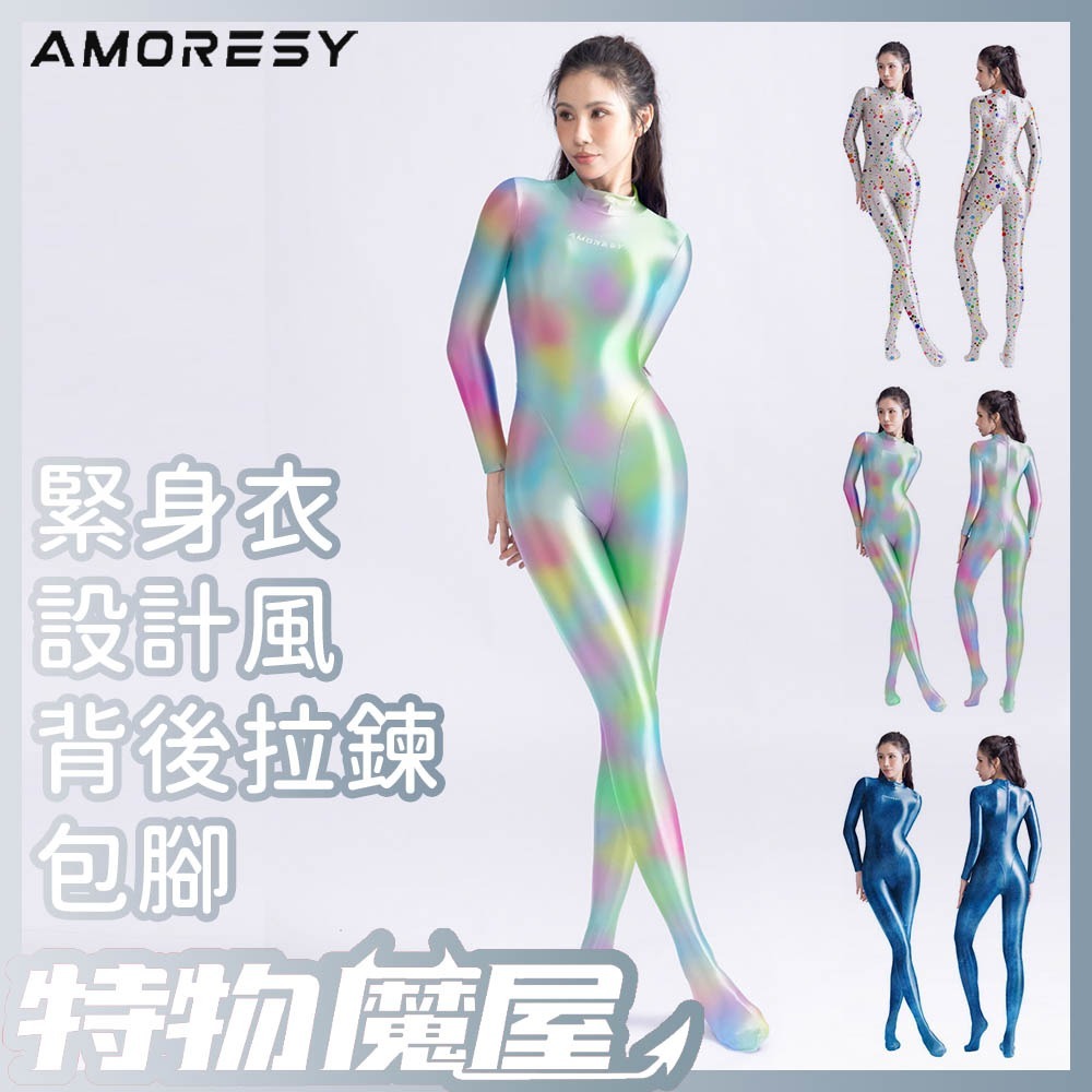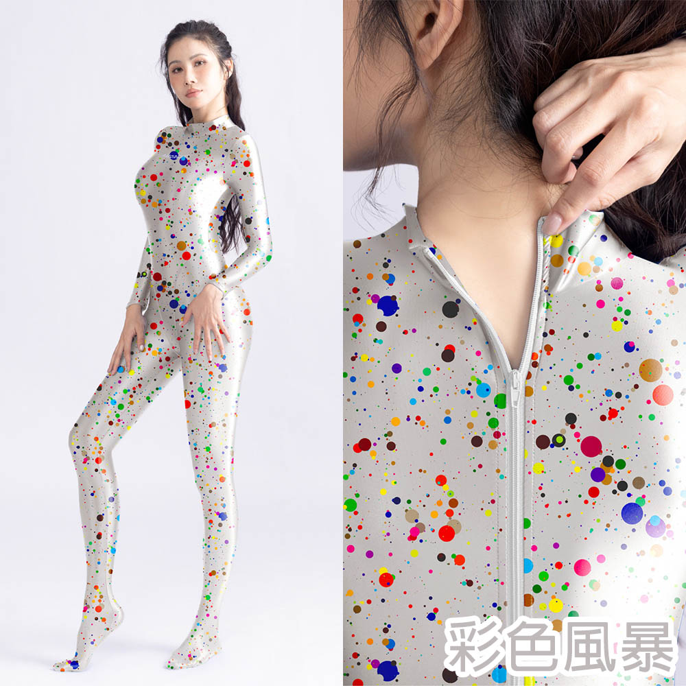 商品名稱:Athena系列 緊身連身衣 圖案設計光澤高彈布料 背後拉鍊 連身長袖包腳緊身衣 泳衣泳裝