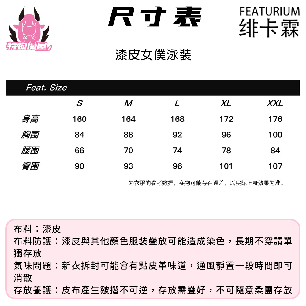 細節:多色多尺寸,無胸墊。漆皮高叉,女僕死庫水