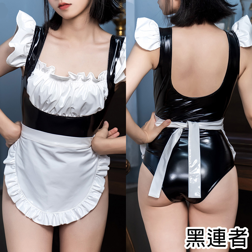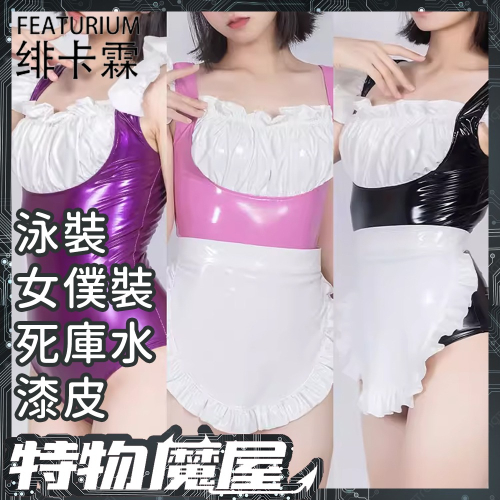 商品名稱:緋卡霖FEATURIUM [Fe.愛心光線用意] 圍裙女僕連身緊身無袖漆皮露背死庫水泳衣泳裝