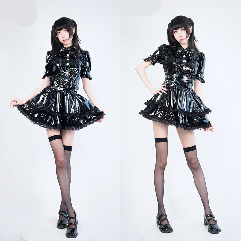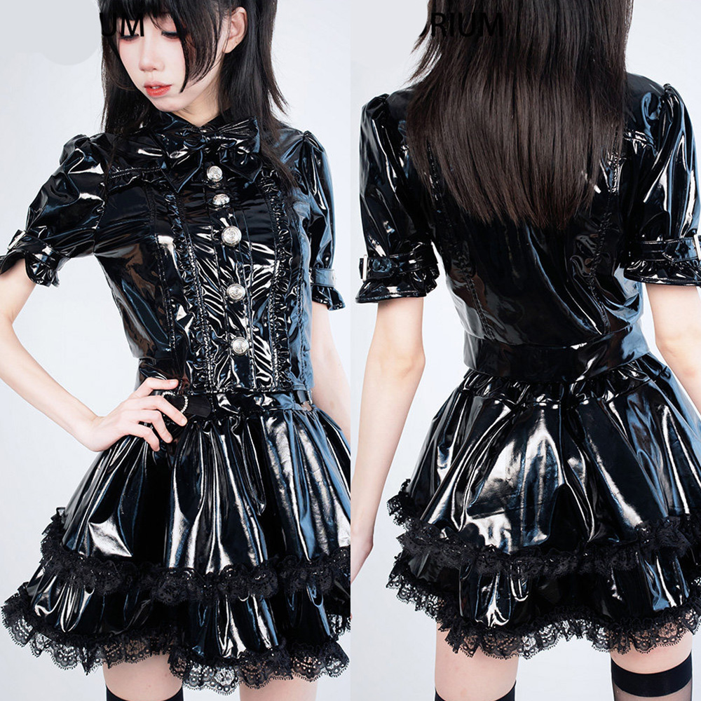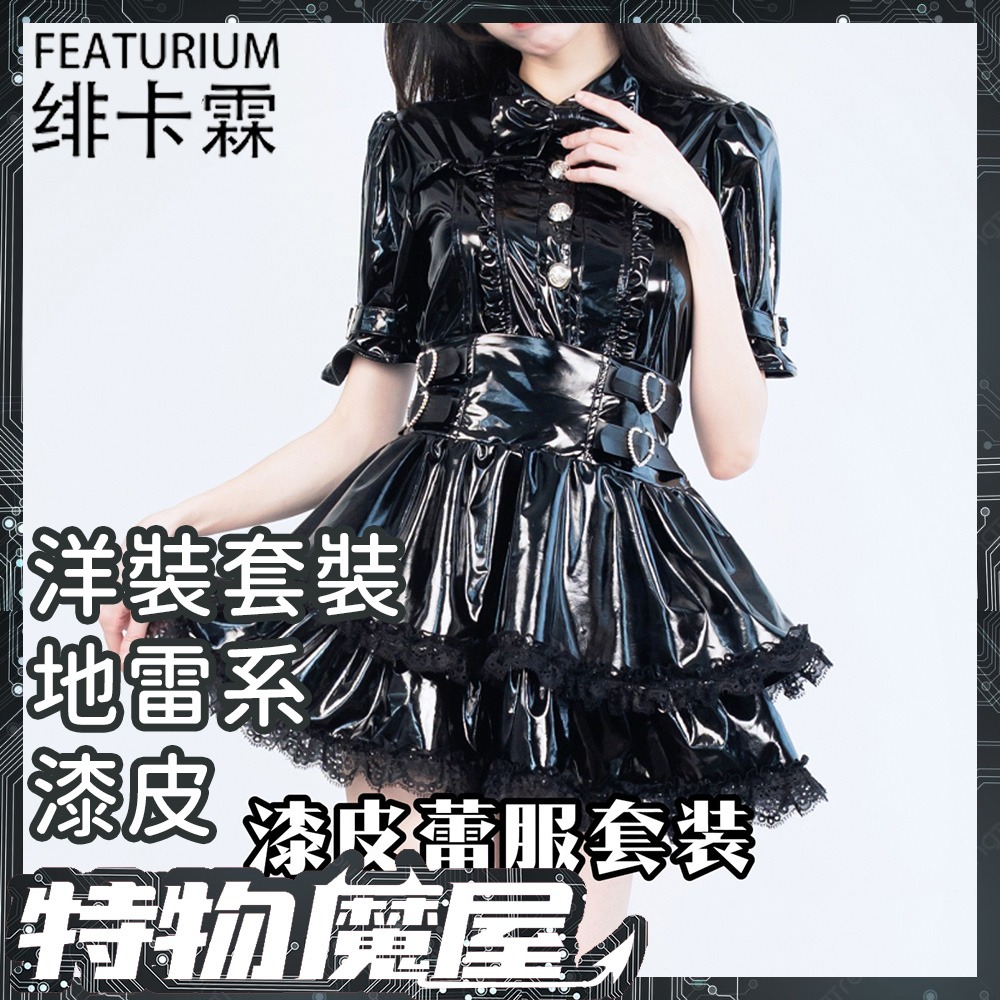 商品名稱:原創日系 漆皮地雷系洋裝套裝 量產系 黑暗系 短袖襯衫上衣皮衣 高腰短裙皮衣