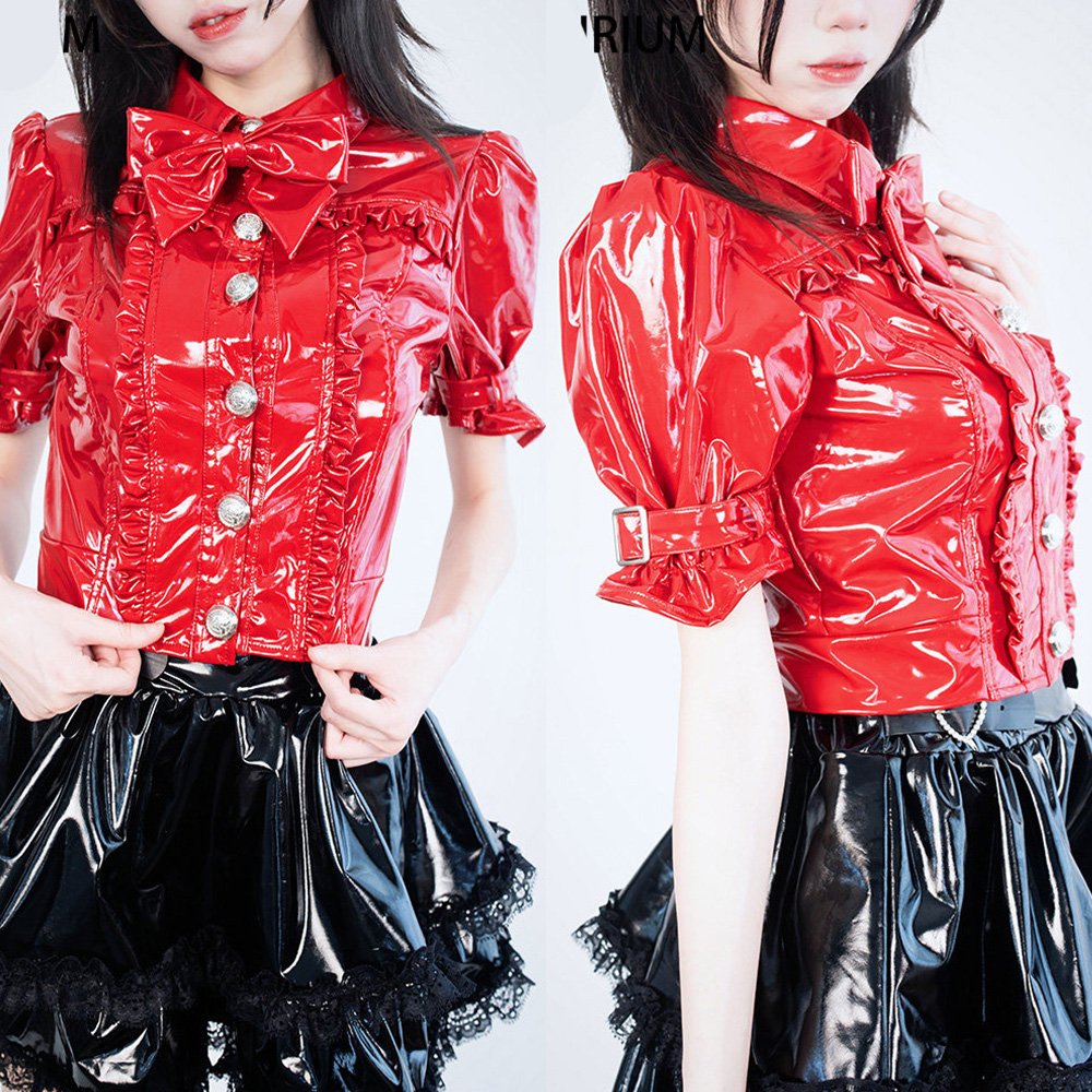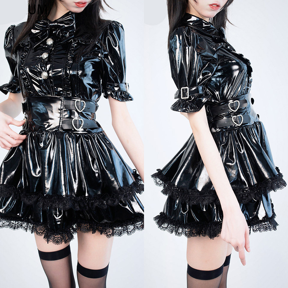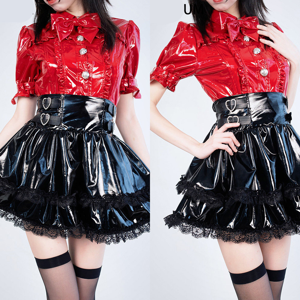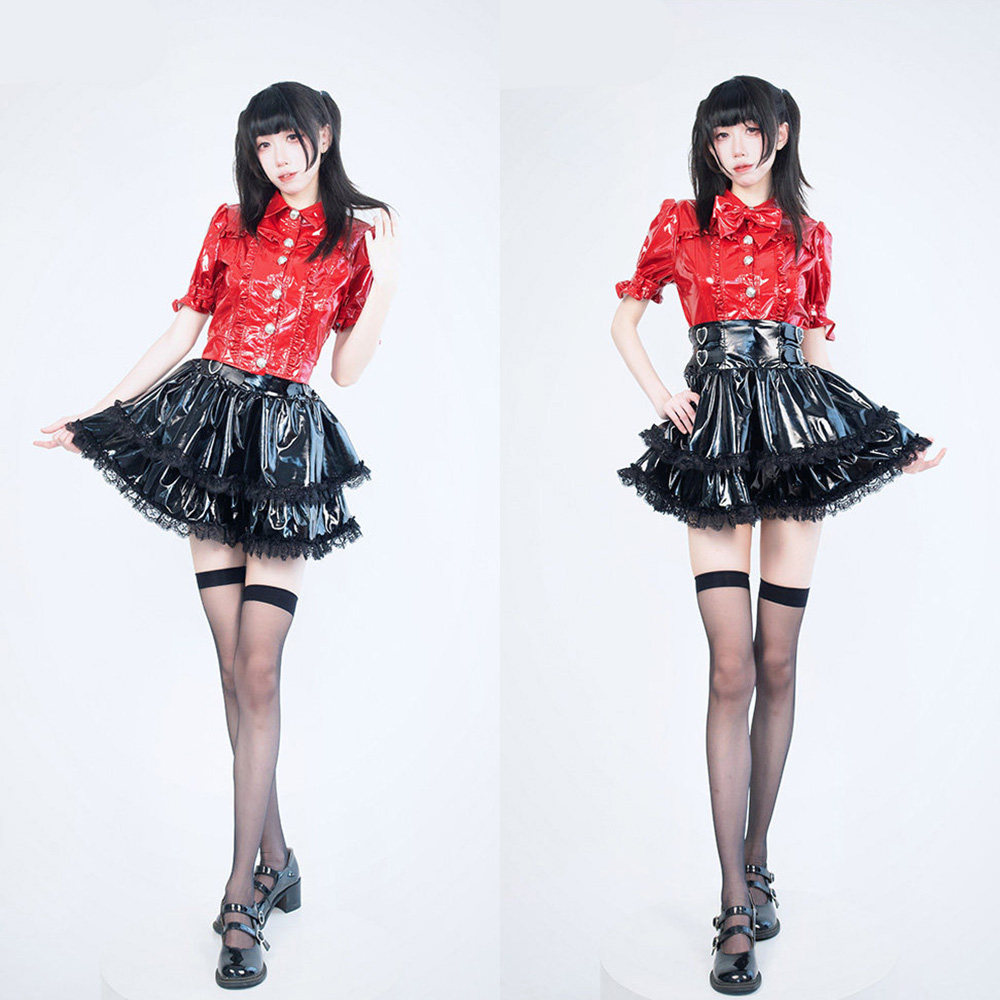 商品名稱:原創日系 漆皮地雷系洋裝套裝 量產系 黑暗系 短袖襯衫上衣皮衣 高腰短裙皮衣