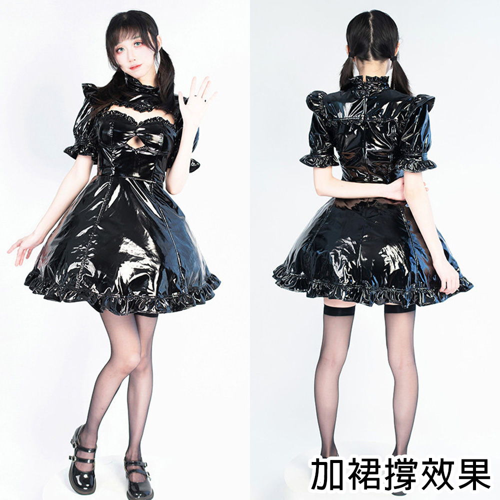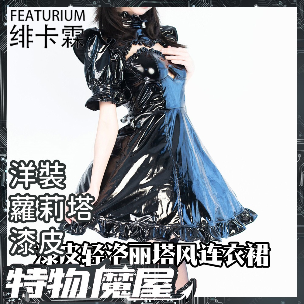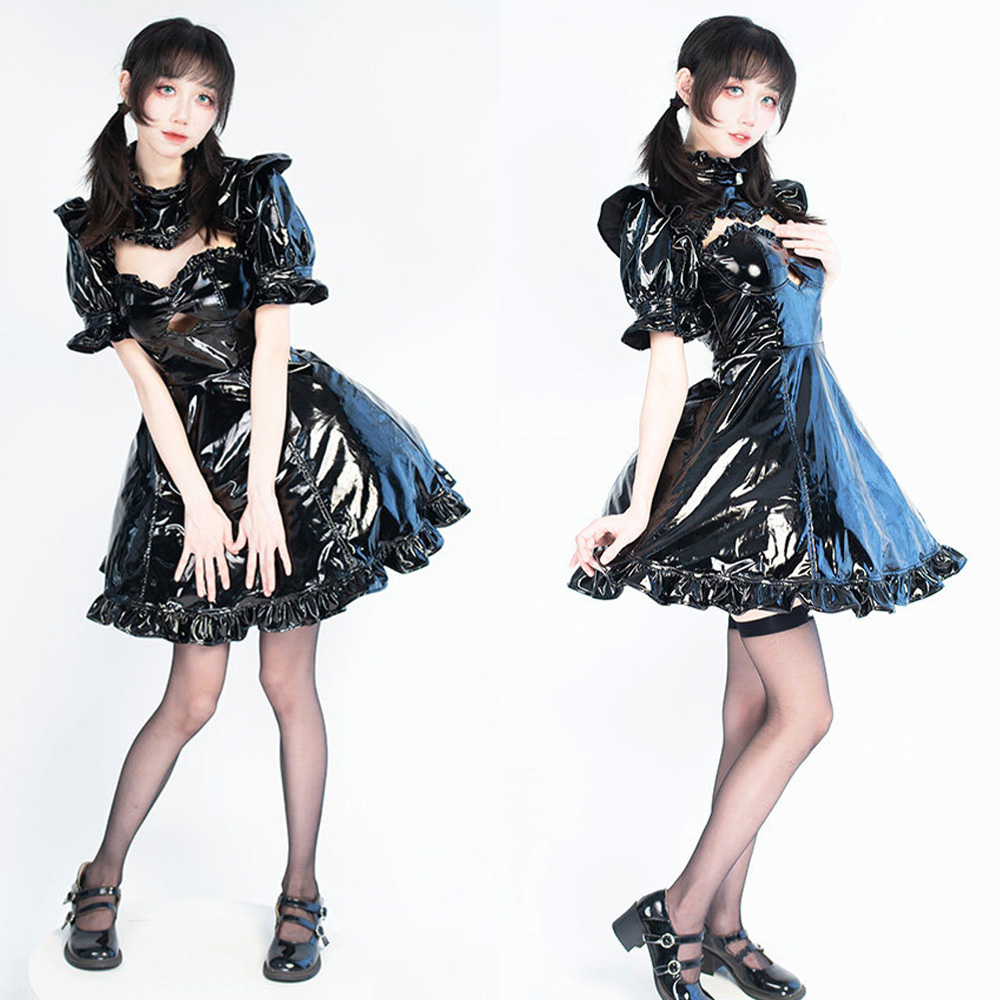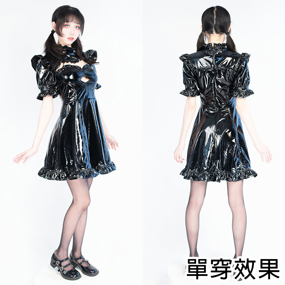 商品名稱:暗黑系鏤空短袖公主袖高領洋裝 歌德風 黑暗視覺系 漆皮蘿莉塔LOLITA風漆皮洋裝