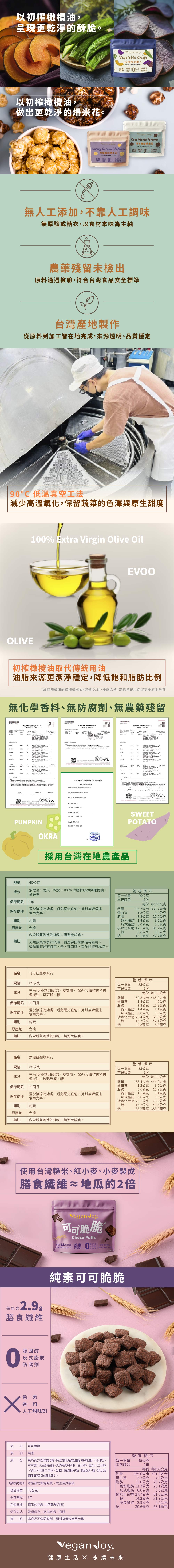 • 爆米花與蔬菜脆片使用特級初榨橄欖油製作,取代高負擔油脂
