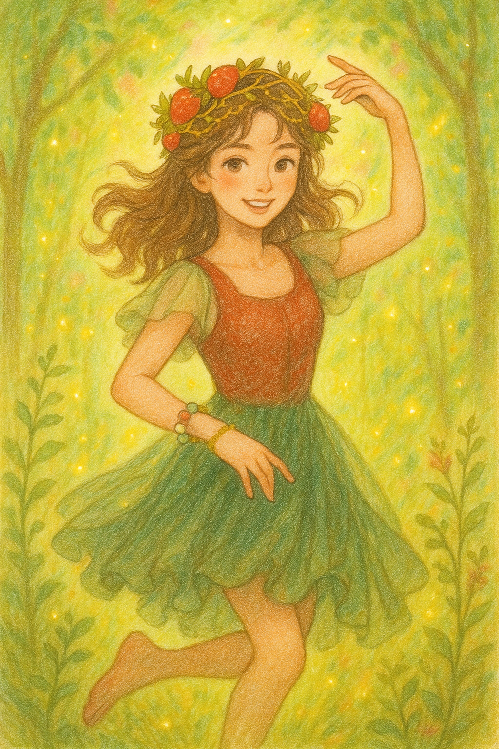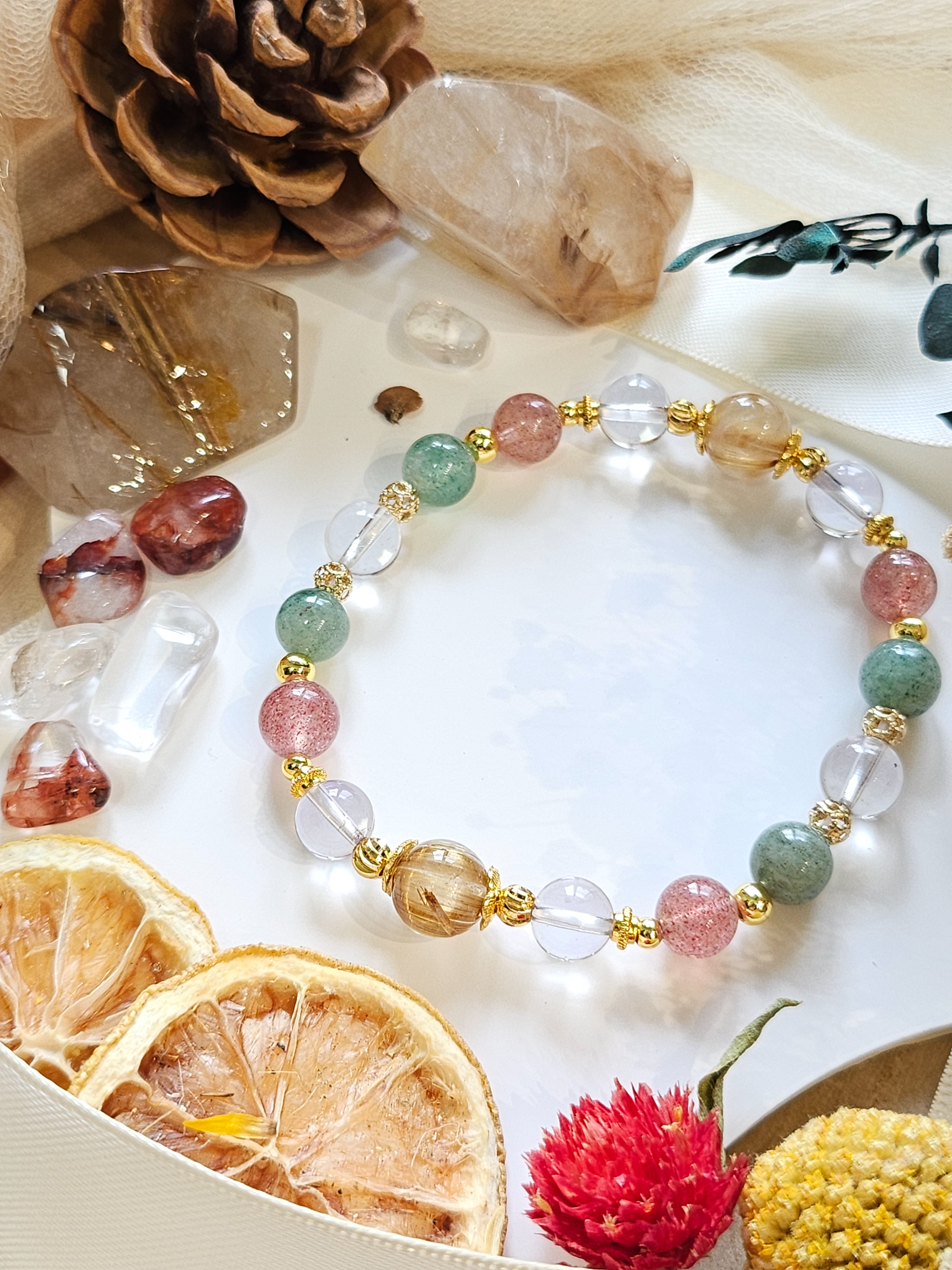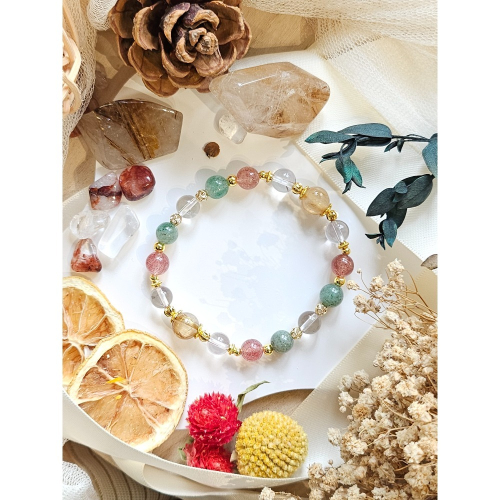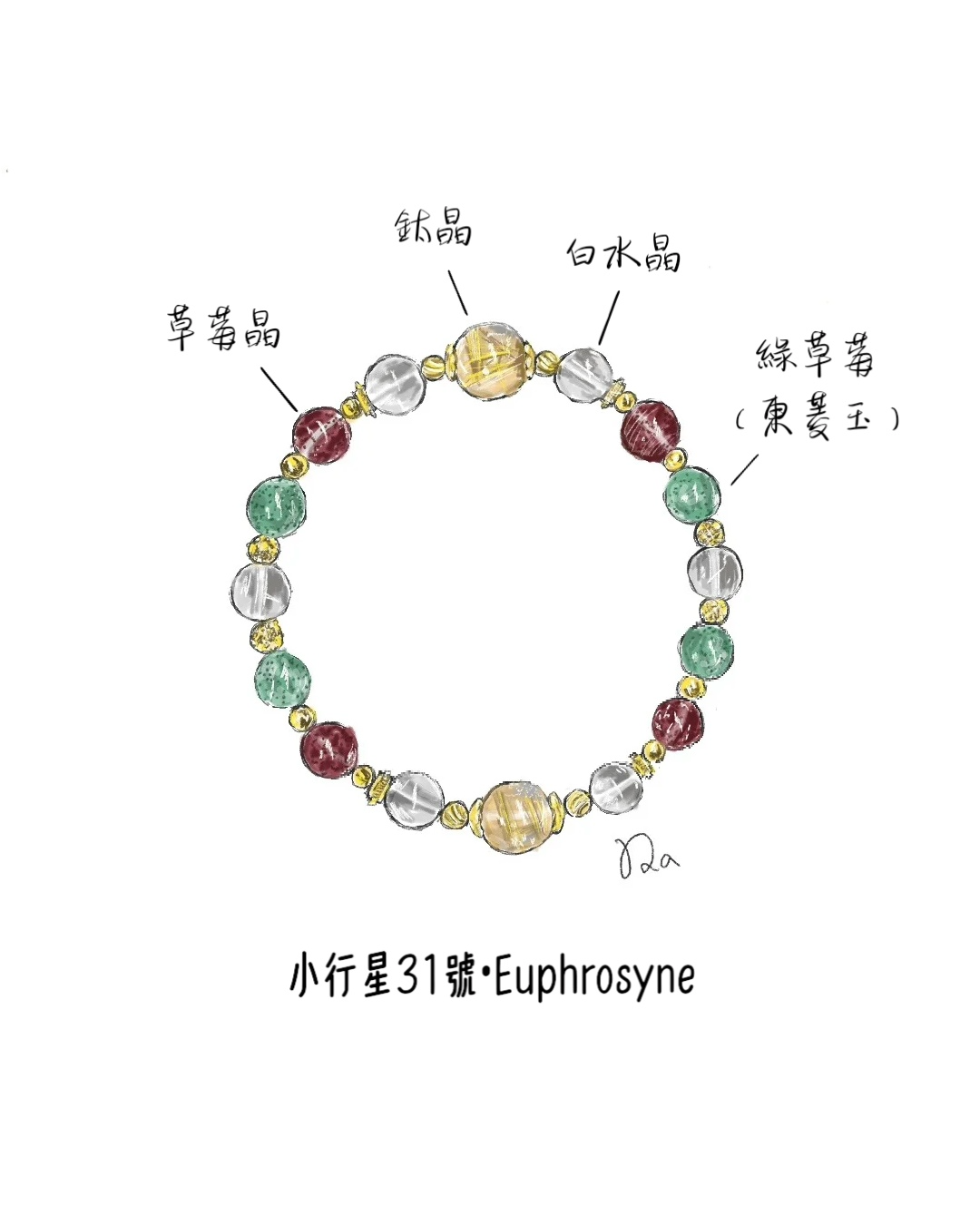Euphrosyne 為希臘神話中「三美神」之一,代表喜悅與歡樂,是輕盈舞動、笑聲盈盈的女神象徵。這款手串結合草莓晶、東菱玉(綠草莓)、鈦晶與白水晶,交織出一種豐盈的正向能量,像是森林中綻放的歡樂魔法。