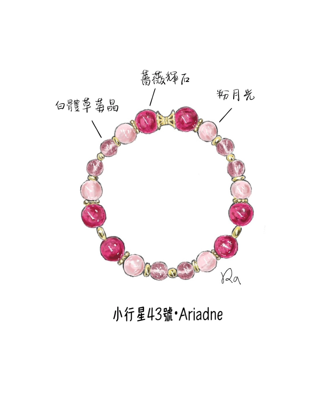Ariadne 是希臘神話中智慧與愛的象徵,她以一團線引導英雄 Theseus 走出迷宮,也象徵著指引、愛與犧牲。這款手串融合了愛的力量與內在指引,為迷失的心靈帶來方向。