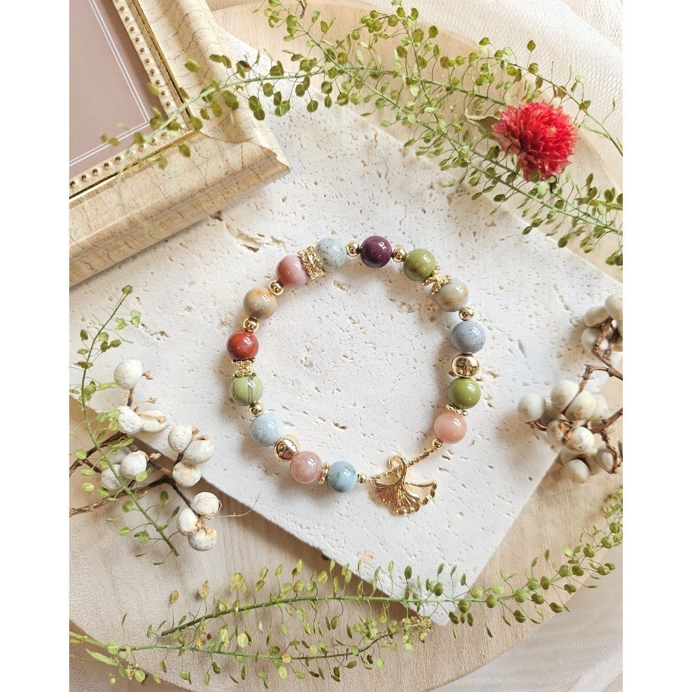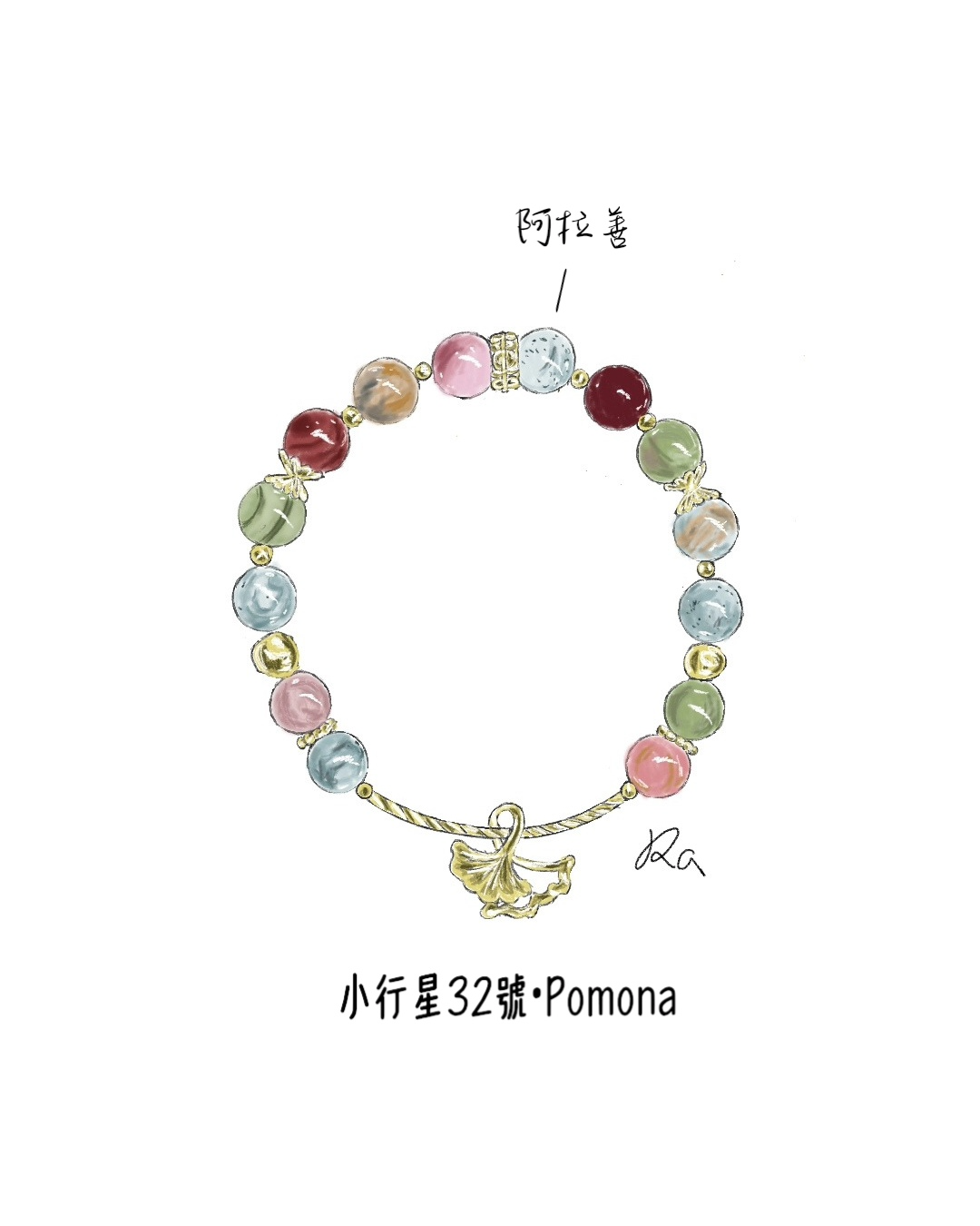 以阿拉善的多色調象徵著自然土地的多樣,再配上銀杏葉的墜飾,整體就像大地女神在微笑守護豐收,非常溫柔而穩定。以羅馬神話中的果園女神Pomona命名,象徵土地的豐饒與循環,自然中的多樣與和諧。