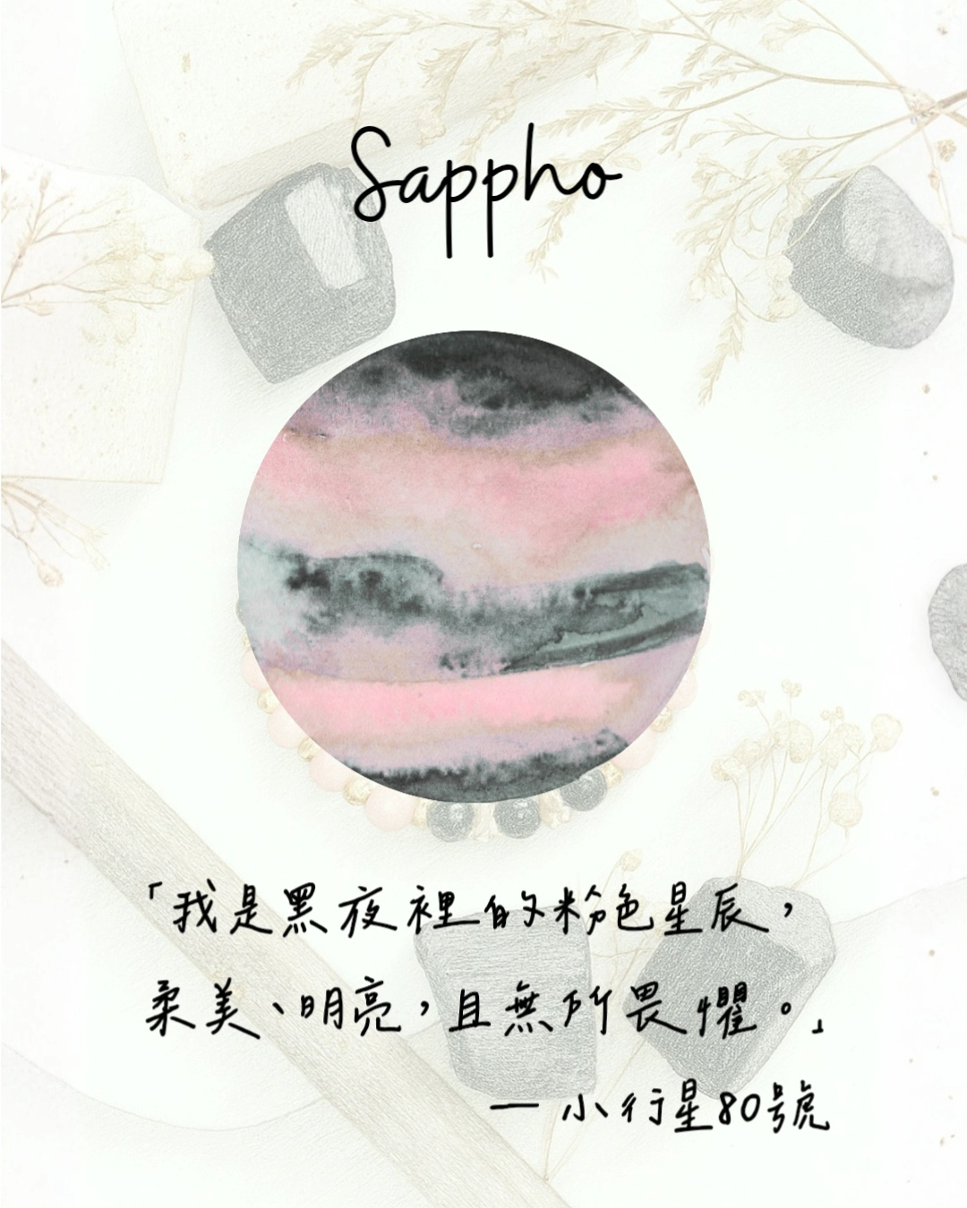 Sappho 是古希臘著名的抒情女詩人,被譽為「愛與藝術的女神之聲」。她的詩句溫柔卻充滿力量,既展現女性的細膩情感,也蘊藏無畏的自我表達。這款手串以她為名,象徵柔軟中的堅定,浪漫中的力量。