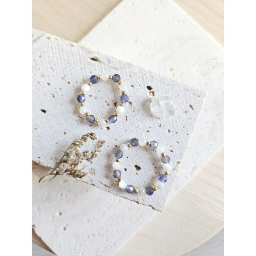 《材質》:堇青石、白蝶貝珍珠、鈦鋼(304不銹鋼包14K金)、彈力線。