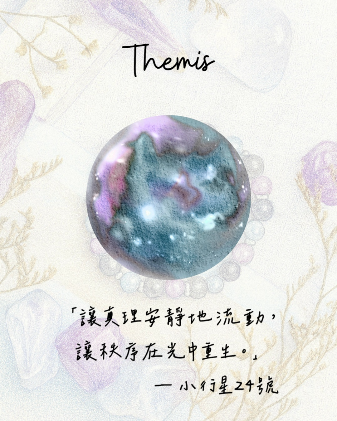 Themis是來自古希臘神話中的正義與秩序女神,她是眾神的顧問,象徵宇宙的法則與自然的平衡。以這份象徵為靈感,小行星24號的能量化作一道清澈的光,帶著平衡與誠實的頻率,提醒人們在動盪與不確定之中,仍能以平靜的心回到本位。