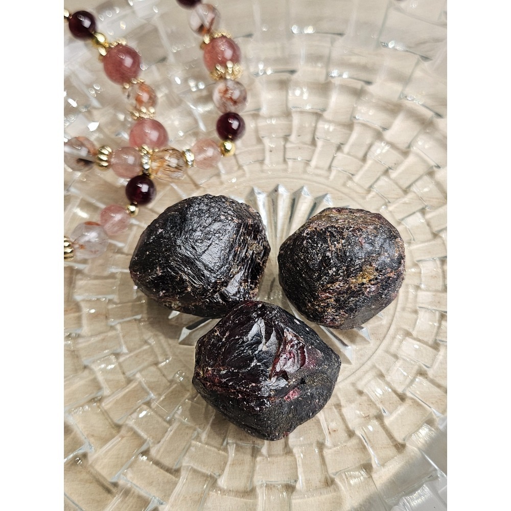 石榴石:在中國古代稱為"紫牙烏",來自阿拉伯語中"寶石"的發音。石榴石有許多種類,台灣常見的是鎂榴石(深紅色)跟鐵鋁榴石(深紅到酒紅,會有星光效應)。屬於等軸晶系,有完美的十二面體,其色澤沉穩而內斂,可把鬆散或虛弱的能量聚集,抵禦負面的磁場。因有如血液般的顏色,自古被認為能夠協助女性婦科的問題。