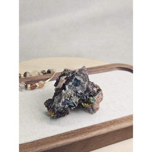 彩銅礦:表面有七彩的金屬光澤,質地較脆。俗稱“孔雀礦”也稱“轉化之石”,象徵蛻變、創意,有助打開直覺跟靈感。