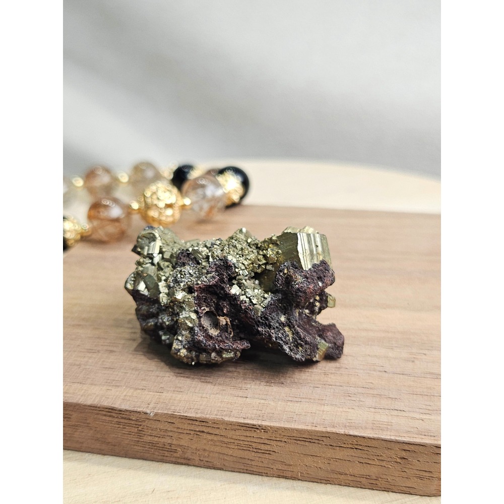黃鐵礦:帶有冷調的金屬光澤,又稱「愚人金」,象徵財富、意志力與保護能量。屬於太陽能量礦石,能強化自信與行動力。幫助集中精神、提升思考與決斷能力。可防止外在負能量干擾,建立強大能量屏障。