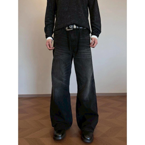 圍剿黑牛王#【all black 以】高克重質感 復古水洗做舊貓須直筒牛仔褲 男女款25411#