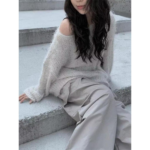 韓國 anyonemore 鬆垮寬鬆落肩圓領長袖針織上衣 白色