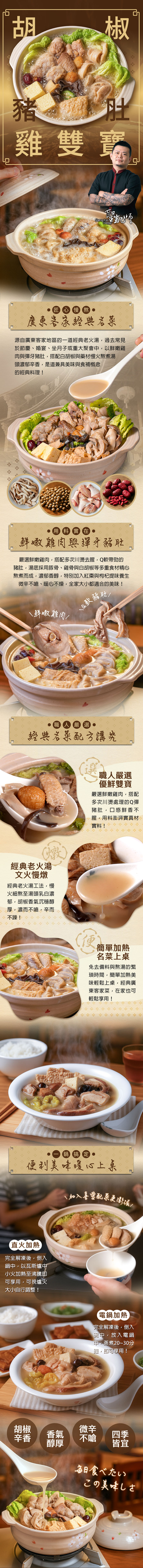成分:水、大白菜、雞肉、豬肚、豚骨高湯醬【乳化豬汁[豬骨、水、豬油、食鹽、維生素E(抗氧化劑)]、水、醬油、蒜油[大豆沙拉油、豬油、蒜頭、食鹽、維生素E(抗氧化劑)]、大豆沙拉油、豬頭骨濃縮汁[水、豬頭骨、豬皮、維生素E(抗氧化劑)]、食鹽、大豆水解蛋白、砂糖、樹薯澱粉、豬骨泥(豬骨、水)、雞骨濃縮汁[雞骨、水、食鹽、維生素E(抗氧化劑)]、蒜、食用酒精、薑、豆瓣醬[紅辣椒、水、黃豆、食鹽、甘蔗液糖(糖、水)、蠶豆、香油(大豆油、芝麻)、麵粉、調味劑(5'-次黃嘌呤核苷磷酸二鈉、5'-鳥嘌呤核苷磷酸二鈉)、玉米糖膠、八角粉]、昆布抽出物[昆布汁(水、昆布)、糊精、水解蛋白(大豆、玉米)、砂糖、食鹽、調味料(L-麩酸鈉、L-天門冬酸鈉、5'-次黃嘌呤核苷磷酸二鈉、5'-鳥嘌呤核苷磷酸二鈉、琥珀酸二鈉)、三仙膠]、蒜粉[香蒜粉(蒜片、玉米澱粉、麥芽糊精)、玉米澱粉]、白胡椒粉[白胡椒、麩皮粉、麥芽糊精、玉米澱粉、綠辣椒、辣椒、茶枝]、昆布粉(昆布粉、葡萄糖、鹽)、油性辣椒紅(芥花油、紅椒色素);食品添加物:L-麩酸鈉、5'-次黃嘌呤核苷磷酸二鈉、5'-鳥嘌呤核苷磷酸二鈉、玉米糖膠】、排骨酥【豬龍骨切、樹薯澱粉、水、味鮮(L-麩酸鈉、琥珀酸二鈉、食鹽、5'-鳥嘌呤核苷磷酸二鈉、5'-次黃嘌呤核苷磷酸二鈉、胺基乙酸、DL-胺基丙酸)、砂糖、鹽、碳酸氫鈉、木瓜酵素﹝碳酸氫鈉、木瓜酵素(麥芽糊精、木瓜酵素、偏亞硫酸氫鈉)、食鹽﹞、白胡椒粉、五香粉(小茴香、肉桂、陳皮、八角、胡荽子、甘草、丁香、當歸、芹菜籽、川芎、山奈)、香蒜粉(蒜粉、麥芽糊精)】、凍豆腐【水、黃豆(非基因改造)、硫酸鈣】、黑木耳、杏鮑菇、鵪鶉蛋、豆皮【黃豆(基因改造)、大豆油;食品添加物:豆類消泡劑(含脂肪酸山梨醇酐酯、二氧化矽、卵磷脂、完全氫化棕櫚油脂)】、白胡椒粉、紅棗、食鹽、枸杞