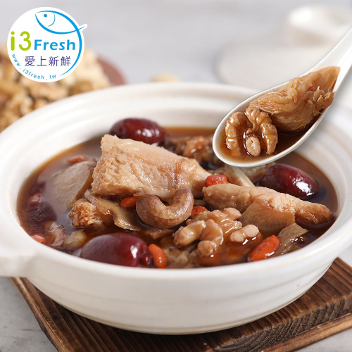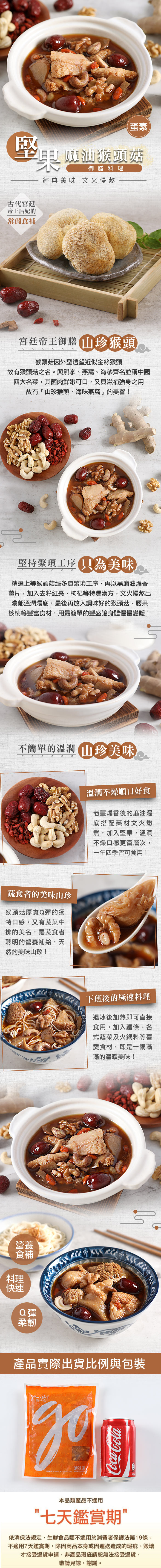 商品成分:水、猴頭菇[猴頭菇、樹薯澱粉、蛋、糖、鹽、大豆沙拉油、蔬菜調味粉(鹽、糖、麥芽糊精、小麥水解蛋白、酵母抽出物、高麗菜抽出物、棕櫚油)]、黑麻油、薑、醬油、紅棗、腰果、核桃、糖、蔬菜調味粉(鹽、糖、麥芽糊精、小麥水解蛋白、酵母抽出物、高麗菜抽出物、棕櫚油)、鹽、枸杞、玉米發酵粉(麥芽糊精、玉米發酵醬)。