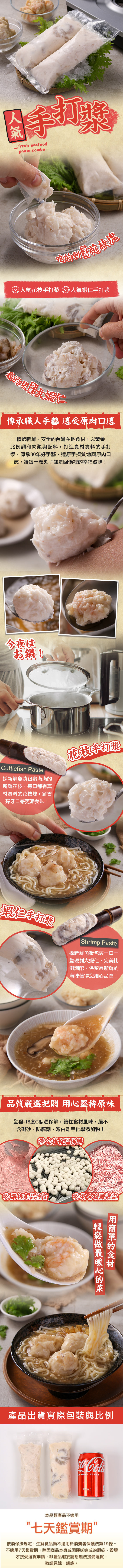 商品成分:冷凍魚漿(金線魚肉、糖、蛋白、多磷酸鈉、焦磷酸鈉)、草蝦仁、冷凍豬脂(台灣)、蒜頭、特砂、精鹽、芝麻油、蛋白粉、小麥蛋白粉、馬鈴薯澱粉、味素(L-麩酸鈉)、葡萄糖、乙基麥芽醇、品質改良劑(多磷酸鈉、焦磷酸鈉(無水)、偏磷酸鉀)、調味劑(DL-胺基丙酸、琥珀酸二鈉、檸檬酸鈉、胺基乙酸、5'-次黃嘌呤核苷磷酸二鈉、5'-鳥嘌呤核苷磷酸二鈉)