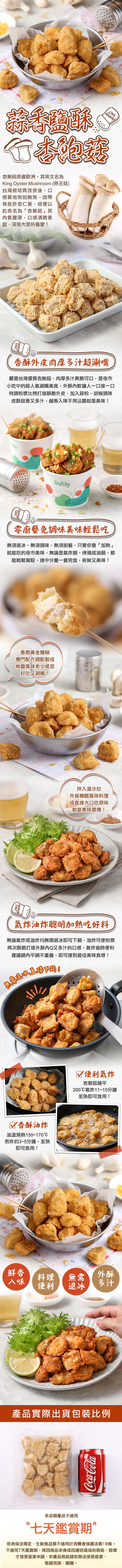商品成分:杏鮑菇、裹粉[麵粉、玉米澱粉(非基改)、樹薯澱粉、蛋白粉、鹽、味精、大豆油、酸性焦磷酸鈉、碳酸氫鈉、乙醯化己二酸二澱粉、玉米糖膠、香料]、精製軟棕油、鹽、胡椒粉、蒜粉、5’-鳥嘌呤核苷磷酸二鈉、5’-次黃嘌呤核苷磷酸二鈉