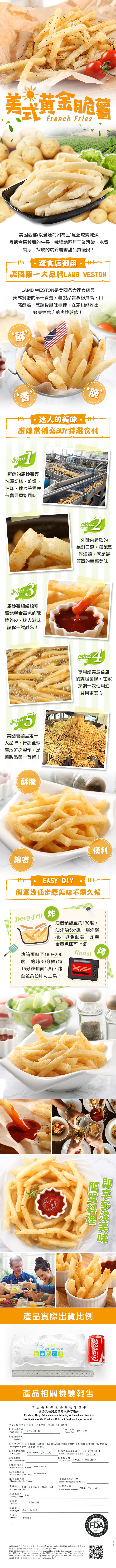 食用方式:需加熱調理使得供食之冷凍食品類。商品無需解凍,油鍋溫度180°C,油炸2~2.5分鐘