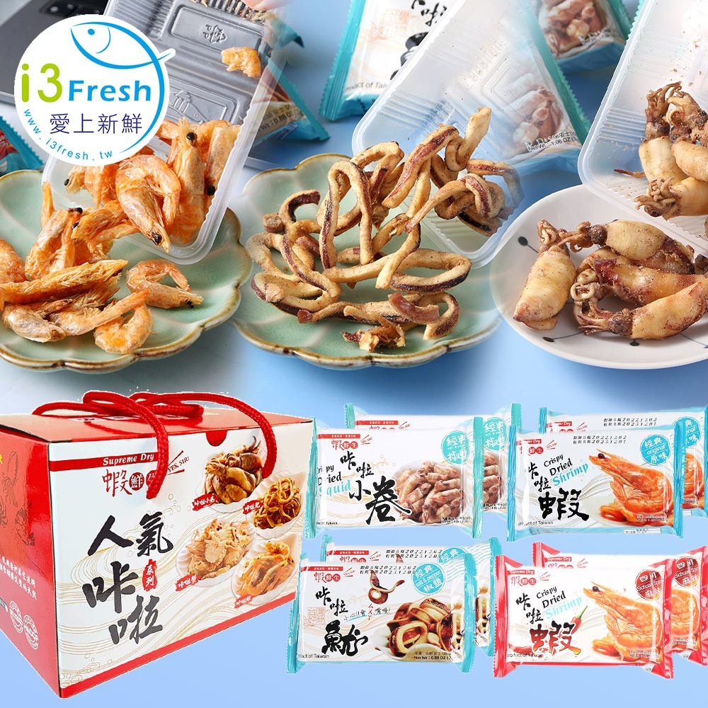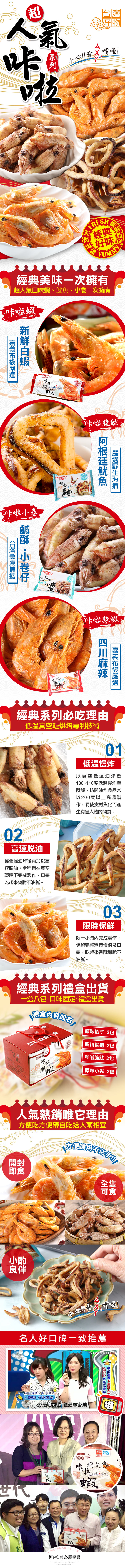 禮盒內含:咔啦蝦(經典原味)2包、咔啦蝦(四川麻辣)2包、卡拉脆魷(原味)2包、咔啦小卷(經典椒鹽)2包 ; 共8包