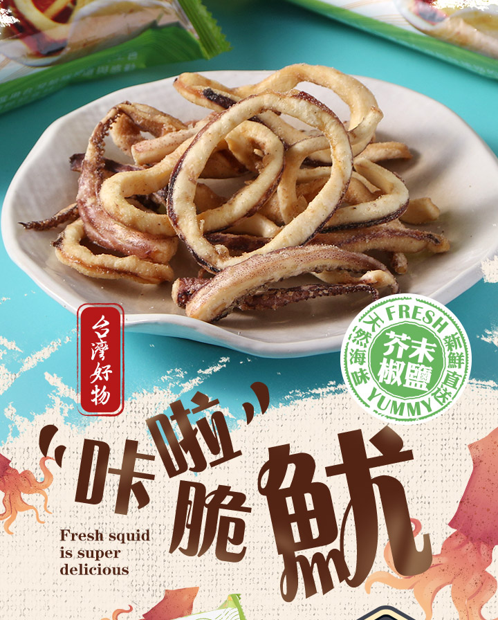 【咔啦脆魷(經典椒鹽)】新鮮魷魚、鹽、糖、棕櫚油、維生素E(抗氧化劑)