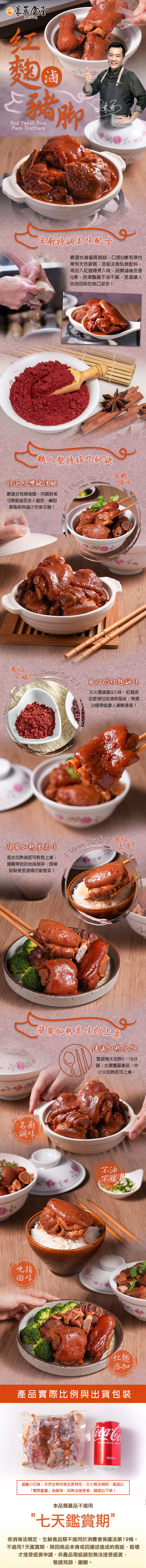 成分:豬腳(台灣)、水、醬油[水、非基因改造黃豆(高蛋白豆片)、小麥、食鹽、酒精]、冰糖、紹興酒(糯米、蓬萊米、小麥)、米酒(米、精緻食用酒精)、紅穀米(在來米、紅麴)、鹽