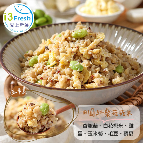 成分:杏鮑菇、花椰菜米、蛋、非基因改造玉米筍、毛豆(非基因改造)、大豆油、醬油、紅藜麥、糖、水、蒜酥(蒜、棕櫚油)、香油(芝麻油、大豆油)、鹽、胡椒粉