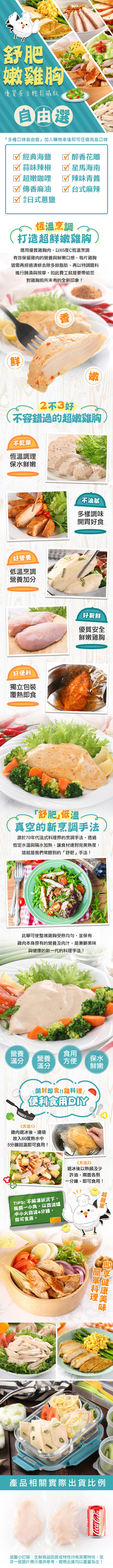 選用優質雞胸肉,以65度C恆溫烹調,有效保留雞肉的營養與鮮嫩口感,再以特調醃料進行醃漬與按摩,就是要帶給您對雞胸前所未有的全新印象!