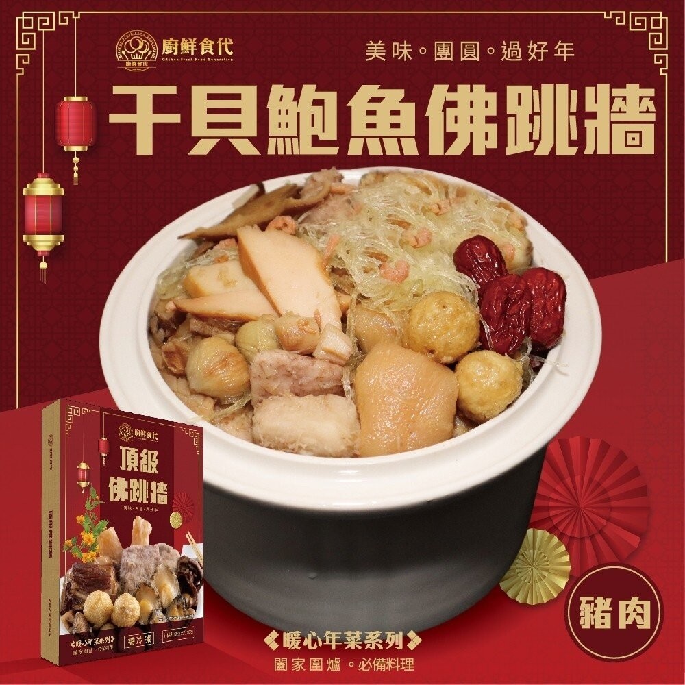 成分:大白菜、筍、干貝、鮑魚、栗子、魚翅、排骨酥(排骨、麵粉、地瓜粉、紅蔥碎、水、醬油(水、非基因改造黃豆(高蛋白豆片)、小麥、食鹽、酒精)、芋頭、豬腳(台灣)、魚皮、腳筋(台灣)、鴿蛋、香菇、魷魚、蝦米、沙拉油、糖、鹽、白胡椒粉、調味劑(L-麩酸鈉)、太白粉