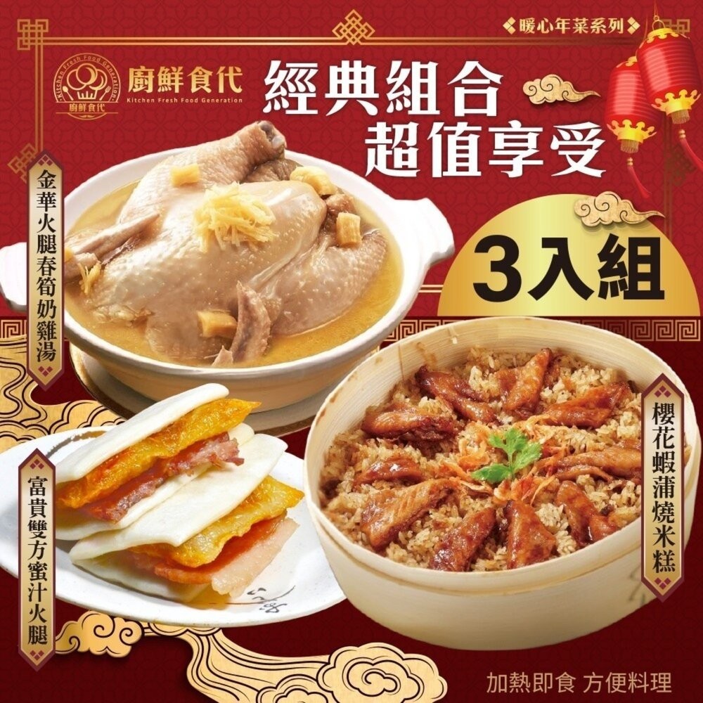 ●櫻花蝦蒲燒米糕-糯米、蒲燒鯛魚腹、蒲燒醬油【水、醬油、[水、脫脂大豆、小麥、食鹽、高果糖糖漿、酒精、調味劑(琥珀酸二鈉、5´-次黃嘌呤核苷磷酸二鈉、5´-鳥嘌呤核苷磷酸二鈉、甜味劑(甘草素)〕、蔗糖、麥芽糖、酒精高果糖糖漿、黏稠劑 (乙醯化己二酸二澱粉、羥丙基磷酸二澱粉、玉米糖膠)、食鹽、著色劑(焦糖色素)、調味劑(乳酸)、食用色素(紅麴色素)】、櫻花蝦、豬肉(台灣)、糖、紅蔥頭、醬油、胡椒粉、桔餅、蒜頭酥(蒜頭、棕櫚油、玉米澱粉、麥纖酥)、鹽。