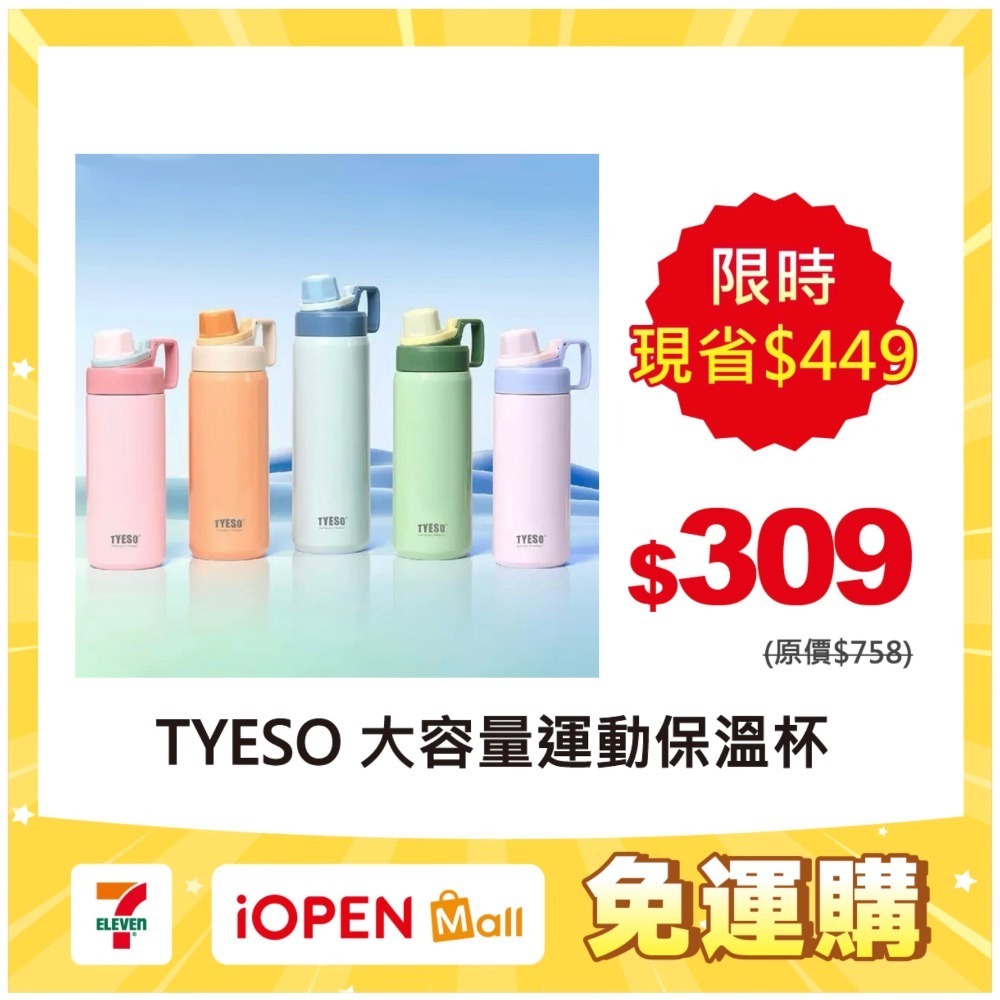 【7-ELEVEN 門市團購】免運TYESO保溫杯304不鏽鋼600ml/750ml/900ml大容量運動保溫附矽膠提手