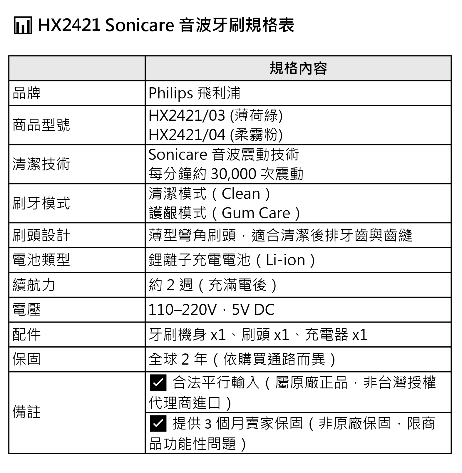 【入門款推薦】PHILIPS 飛利浦 HX2421 電動牙刷 輕柔潔淨 音波震動 14天續航