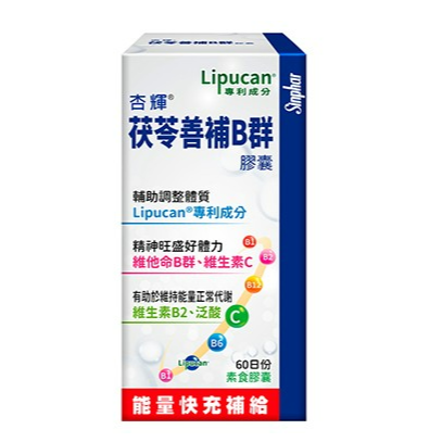 維生素C、菸鹼醯胺、膠囊殼(羥丙基甲基纖維素、純水、鹿角菜膠、食用紅色六號、二氧化鈦、氯化鉀、食用藍色㇐號)、微結晶狀α-纖維素、本多酸鈣、茯苓萃取物(含羊毛蘭烷三萜類)(馬鈴薯澱粉、茯苓萃取物)、維生素B1、維生素B2、維生素B12(麥芽糊精、檸檬酸鈉、檸檬酸、維生素B12)、硬脂酸鎂、維生素B6、二氧化矽、葉酸