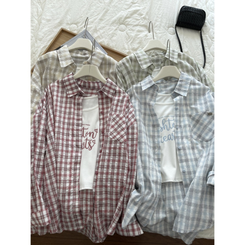 預購款C159/設計感粉紅格紋防曬襯衫女通勤 兩件式寬鬆遮肉翻領長袖襯衫