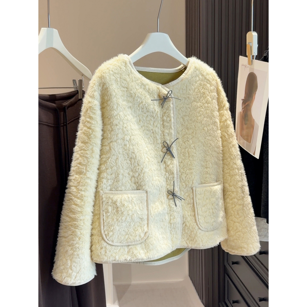 預購款C176/蝴蝶結扣圓領百搭皮毛外套