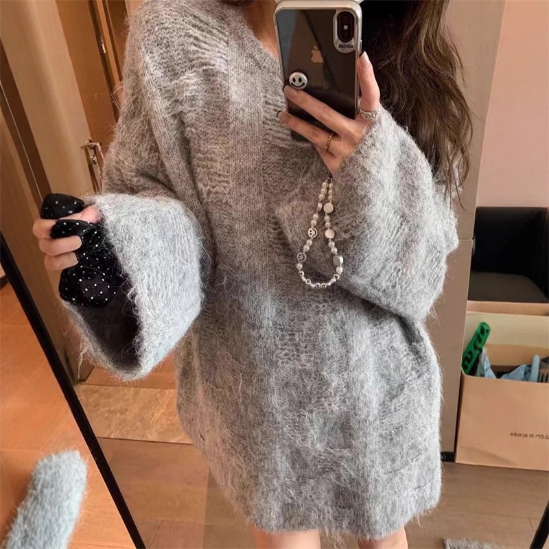 預購款C218/YS純色破洞圓領軟糯秋冬寬鬆慵懶風針織毛衣
