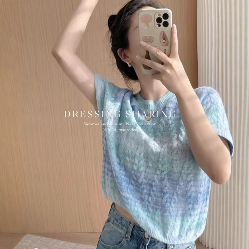預購款C222/YS圓領花朵天藍色漸層馬海毛冰絲短袖針織衫初秋小眾正肩短上衣