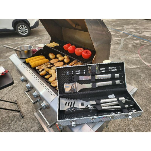 ★★★一筆訂單,限一個商品★★★ 【商品特色】 享用野外風味,享受原始風光~ 不鏽鋼燒烤工具15件組,漏鏟、燒烤刀、燒烤串、燒烤油刷、燒烤叉、夾子,準備齊全!! 硬殼提箱攜帶方便更好收納,送禮也大方 【商品規格】 規格:不銹鋼鏟X1、燒烤刷X1、燒烤串X8、燒烤油刷X1、燒烤叉X2、夾子X1 尺寸:如圖 材質:不鏽鋼、矽膠等 ★★★一筆訂單,限一個商品★★★ #BBQ #燒烤 #露營 #野炊用具