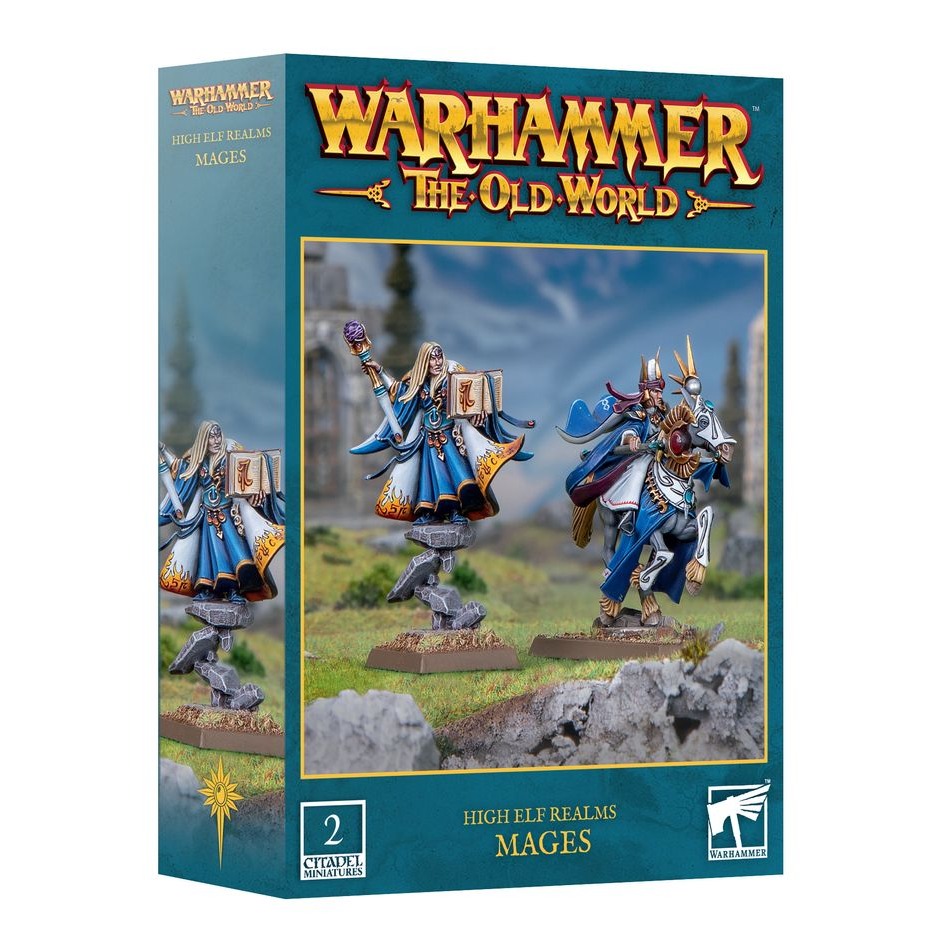 This multipart plastic kit builds two High Elf Mages – one on foot and one atop a barded Elven steed – powerful Wizards for High Elf Realms armies in games of Warhammer: The Old World. These masters of the arcane arts are able to unleash the powers of the Winds of Magic upon your foes.