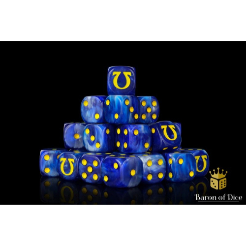 These contain a blend of regal, deep, and righteous blues swirled with heroic white swirl and inlaid with an honorable, easy to read, yellow; resin hand-swirled dice. The symbols are on the 6 side.