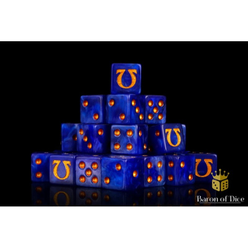 包含了莊嚴、深邃且正直的藍色混和英勇白色並嵌有金屬金色的16mm樹酯骰子,標誌代表6