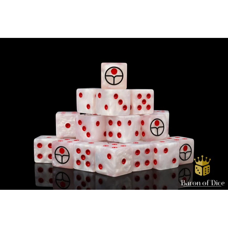 These contain a mix of chivalrous whites swirled with a smokey grey and inlaid with a two-toned pure black and bloody red; resin 16mm dice. The symbols are on the 6 side.