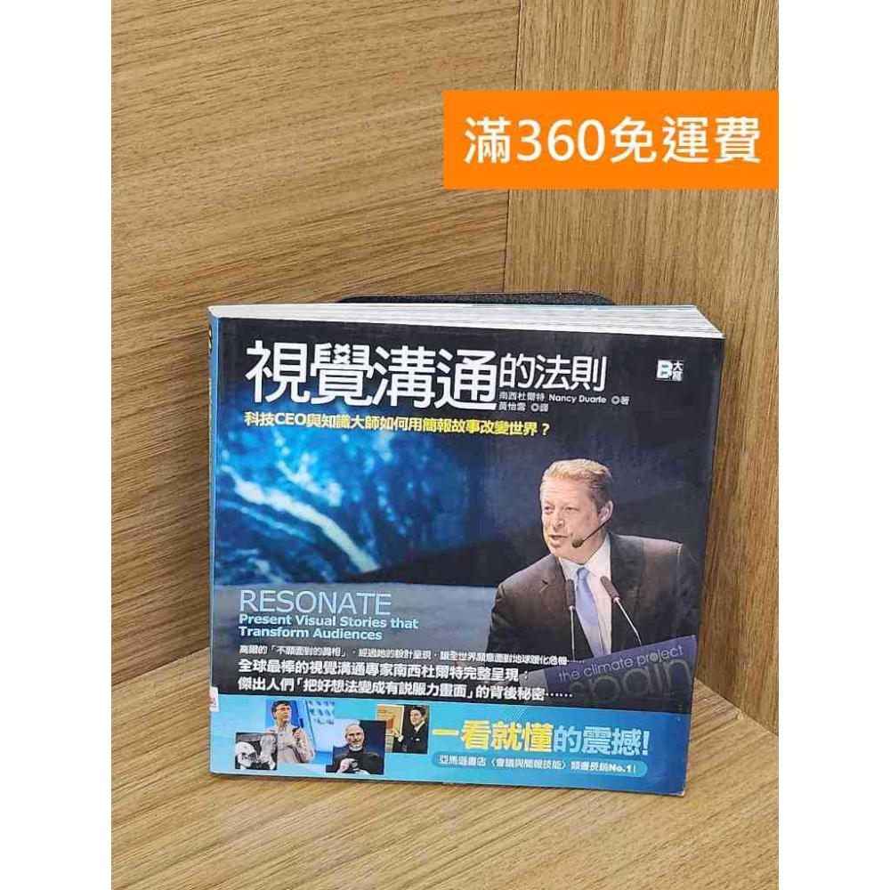 【雷根二手書店】 【本書書況】 【八成新】使用痕跡,輕微泛黃或書斑,兩者有其一或並存 【注意事項】 (1) 買書送贈品,樣式隨機出貨,一單只送一組,數量有限,贈完為止 (2) 本賣場無限時段,購物滿360元免運費 (3) 超商有限重,除漫畫類別,超過購買超過10本請分開結帳 (4) 書況如商品圖,皆為實際拍攝,如想看其他書況細節請私訊賣家 (5) 二手書難免有少許劃記或輕微水漬、書章等書況,如很在意請先詢問詳細書況 (6) 收到商品後如書況與描述不符或瑕疵(如損毀、劃記多),請與賣家聯繫,可退書款或小額補償 --------------------------------------------------------- 絕對好看的「視覺最佳化」工具書,「用看的」行銷新概念、好點子,!  Amazon網路書店[簡報與技能類書]長銷榜首!   揭開傑出人們用簡報改變世界、「把好想法變成有說服力畫面」的背後秘密……   全球最棒的視覺溝通專家將在本書告訴你,簡報是「最棒的人類溝通工具」,揮別一成不變、無聊乏味、言之無物的傳統投影片格式,換用情感訴求與故事手法,創造真正生動出色、能使觀眾動心並採取行動的精采簡報。   本書作者杜爾特與她的設計團隊最知名的事蹟,就是將前美國副總統高爾的〈不願面對的真相〉重新設計為一則感動全球的視覺故事,並且將他與地球暖化議題的連結形象推送到全世界,後來甚至讓他獲頒諾貝爾和平獎。   杜爾特將在本書中提出:「讓觀眾有共鳴」的簡報技術──如何塑造感動人的視覺故事?讀者將會學到如何規畫「一步步誘導人心」的簡報結構,以及製作出兼具故事、啟發與從頭到尾吸引觀眾的場景。   透過本書學習善用簡報的力量,不論是職場溝通或宣傳點子,都會讓你多具備一份「用視覺改變人心」的新奇優勢!   【15個經典案例.完整收錄偉大視覺溝通者的背後方法】   從物理大師費曼,到蘋果前CEO賈伯斯、傑出企業奇異∕思科、大師舞者瑪莎葛蘭姆、指揮家伯恩斯坦……等;本書將全面分析,傑出人物與組織,如何運用突出的視覺溝通方法製造亮點;完成發表產品、征服人心與宣揚信念的目的!   【全面圖解:偉大的視覺故事技巧有哪些?怎麼做?】   想設計與執行一場毫不乏味、讓大客戶或重要聽眾產生深刻共鳴的「視覺故事行銷秀」嗎?本書將提出許多有效建議:   .製造難忘的戲劇化:它們可以是秀出簡單的道具或演示,讓人們看了印象深刻。   .用重複的小音樂助興:小型又可重複的聲音,幫助人們記得住,「這一段」的背景,以及它和聲音之間的重要暗示。   .令人回味的視覺效果:圖片勝過千言萬語。一個引人注目的圖像可以成為一個令人難忘的情感連結到人們的腦中。   .用故事召喚感情:用故事包含訊息,人們會更難忘。在某些視覺簡報中,附加一個偉大的故事,這種大思路會使得簡報更動人!   .令人震驚(但不只是死板呈現)的統計數字:數字下的真相有時很嚇人,經過好設計再呈現出來,它能帶領簡報觀眾「離開安全舒服的地方」,開始思考這場簡報對自己的意義!   【獨家見解─9大視覺溝通的法則】   用簡報創造最美好的溝通經驗,本書的9大法則一次說完:「好簡報從哪來?又能為你做什麼?」   [1] 共鳴,會帶來改變。  [2] 把故事安裝在簡報裡,會讓結果大幅改觀。  [3] 如果簡報者調到了觀眾的共鳴頻率,人們就會開始移動。  [4] 除非被迫改變,否則每位觀眾都會維持一種靜止的狀態   [5] 利用大創意過濾掉所有讓人們產生共鳴頻率以外的頻率。  [6] 「結構」的威力,比它每個部分加起來的總和更巨大。  [7] 「難忘的時刻」一再重複與發送,這樣它們才能涵蓋更長的距離。  [8] 觀眾的興趣多高,會和簡報者做了多少準備成比例。  [9] 你的想像力可以創造現實。 作者簡介 南西杜爾特(Nancy Duarte)   杜爾特設計(Duarte Design)創辦人與領導者,該公司獲獎無數,也是許多大企業如思科、奇異、微軟及Adobe的視覺溝通與專案合作團隊。 譯者簡介 黃怡雪   現為兼職譯者。譯著有:《心理醫生勸你戒掉的10種判斷習慣》,另也從事影視字幕翻譯,翻譯影片橫跨各領域,其中最著名的作品為電視影集《慾望師奶》。