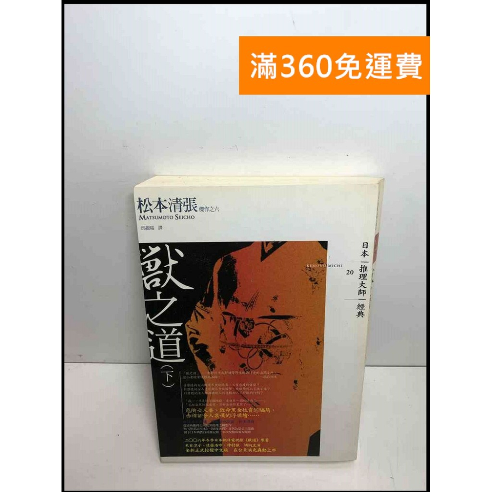 【雷根二手書店】 【本書書況】 【8成新】使用痕跡,輕微泛黃或書斑,兩者有其一或並存 【注意事項】 (1) 買書送贈品,樣式隨機出貨,一單只送一組,數量有限,贈完為止 (2) 本賣場無限時段,購物滿360元免運費 (3) 超商有限重,除漫畫類別,超過購買超過10本請分開結帳 (4) 書況如商品圖,皆為實際拍攝,如想看其他書況細節請私訊賣家 (5) 二手書難免有少許劃記或輕微水漬、書章等書況,如很在意請先詢問詳細書況 (6) 收到商品後如書況與描述不符或瑕疵(如損毀、劃記多),請與賣家聯繫,可退書款或小額補償_x000D_ ---------------------------------------------------------_x000D_ 人性的弱點不外乎是情感的牽拌與金錢權力的誘惑,促使邪惡吞噬良知,一步步邁向泯滅人性的道路。 什麼樣的女人既有天使的純真,又有惡魔的貪婪?什麼樣的女人竟能嚮往金錢權勢、放縱情慾而不愧不悔?什麼樣的女人選擇擺脫人性桎梏加入了野獸的隊伍? 「我……只是從這個地獄,走進另一個地獄而已……」「已經染黑的玩意兒,沒辦法染得更黑了……」 危險女人香、致命黑金性貪欲騙局,赤裸卻令人哀嘆的浮世繪…… 縱橫日本文壇.跨越世紀巨匠 松本清張從經典推理走向犯罪推理之轉型作與《黑革記事本》、《壞傢伙們》並列為惡女三部曲創下日本銷售百萬冊紀錄.多次改拍成電視電影 二○○六年冬季日本朝日電視劇《獸道》原著米倉涼子、佐藤浩市、仲村徹 領銜主演全新正式授權中文版 在台未演先轟動上市 「獸之道」──意即羚羊或野豬等野生動物行走的山間小路,登山者經常誤認為山路。──摘自內文 在芳仙閣工作的31歲女子成澤民子,其丈夫寬次因腦中風癱瘓臥床。民子一邊照顧重病丈夫,一邊負擔生活家計,虛度了黃金歲月。某天,她在赤(土反)的某飯店總經理小瀧的唆使下謀殺了親夫,並從此下落不明。刑警久恆直覺認為民子涉嫌重大,開始追查她的行蹤。這段期間,民子為了滿足一己之慾,遂而成為政治金融界幕後黑手「鬼頭」的情婦,從此踏上了違反人倫的野獸之路…… 持續追查民子下落的久恆刑警,深信高速公路公團理事長的自殺及總裁人事的黑幕都是鬼頭所為,鬼頭的過去充滿了不為人知道謎團,並牽涉到多起複雜的刑案,鬼頭一邊榨取民子的青春肉體,一邊在病榻前操弄政治金融界,使得民子與久恆都捲入風暴。這些行走於獸之道上的人們,展現了人性的險惡面與愛恨糾葛,在日本的權力機構下面臨前所未有的抉擇。 作者簡介 松本清張Matsumoto Seicho(1909-1992) 日本昭和時代最後一位文學巨擘社會派推理小說一代宗師 1909年生於北九州市小倉北區。因家境清寒,十四歲即自謀生計。經歷過印刷工人等各式行業後,任職於《朝日新聞》九州分社。1950年發表處女作<西鄉紙幣>一鳴驚人,並獲選為直木賞候補作品;1953年以<某「小倉日記」傳>摘下芥川賞桂冠,從此躍登文壇,開啟了專業作家的生涯。1957年2月起於月刊上連載《點與線》,引起巨大迴響,開創了社會派推理小說的先河。 終其一生,以其旺盛的創作力著作等身,涵蓋小說、評傳、紀實文學、古代史、現代史等,堪稱昭和時代最後一位文學巨擘,亦是後輩作家景仰的一代宗師。 譯者簡介 邱振瑞 嘉義縣人。譯有宮本輝《流轉之海》、《地上之星》、《血脈之火》、《天河夜曲》;山崎豐子《女系家族》、《女人的勳章》(以上為麥田出版),松本清張《點與線》、《黑革記事本》、《砂之器》、《眼之壁》(獨步文化出版)等書。著有小說集《菩薩有難》(二○○六年商周出版) #獸之道 #松本清張著; 邱振瑞譯 #獨步文化