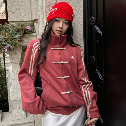 【LUNA-K】adidas 蛇年限定款三葉草中式盤扣麂皮立領外套 紅色*S-XL。C50820