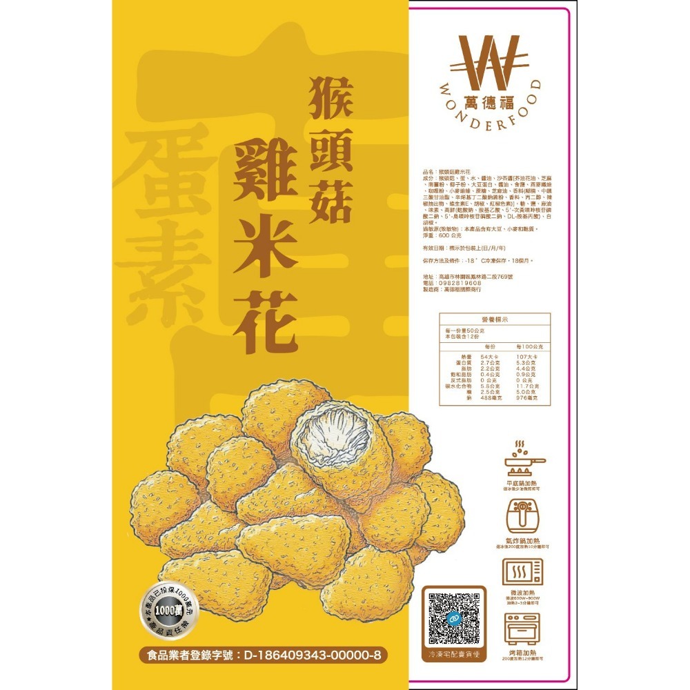 成分重點:猴頭菇、麵粉、大豆蛋白/調味料等;過敏原:蛋、大豆、含麩質之穀物