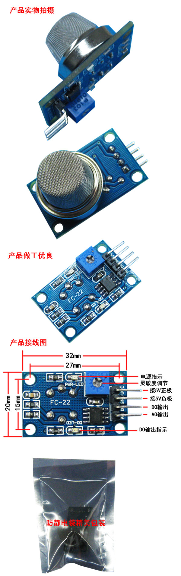 MQ-2氣體感測器所使用的氣敏材料是在清潔空氣中電導率較低的二氧化錫(SnO2)。當感測器所處環境中存在可燃氣體時,感測器的電導率隨空氣中可燃氣體濃度的增加而增大。使用簡單的電路即可將電導率的變化轉換為與該氣體濃度相對應的輸出信號。 MQ-2氣體感測器對液化氣、丙烷、氫氣的靈敏度高,對天然氣和其他可燃蒸汽的檢測也很理想。這種感測器可檢測多種可燃性氣體,是一款適合多種應用的低成本感測器。