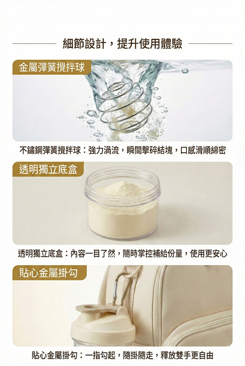 🌪️ 30秒極速搖勻|不鏽鋼金屬攪拌球 告別卡喉嚨的結塊乳清!每組搖搖杯皆附贈一顆高品質不鏽鋼螺旋球。藉由物理攪拌原理,輕輕上下搖晃,即可快速打散粉末,製作出如奶昔般綿密滑順的飲品。