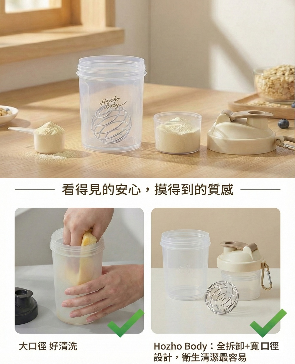 🌟 獨家「自帶空間」設計|底部獨立粉盒 出門運動不用再另外帶夾鏈袋或整罐乳清!杯底設有可拆卸式透明粉盒,容量約 150ml,剛好能裝入一份 Hozho Body 乳清蛋白粉。運動完,旋開倒入水杯,隨時隨地補充滿滿能量。